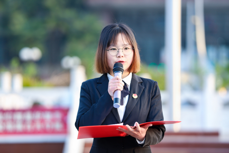 文学院学生代表1901班岳艳玲作国旗下的演讲。她以“缅怀先烈,立志成才”为主题,号召新时代青年以先烈们不畏艰难、勇于献身的革命精神鼓舞斗志、坚定信心、发奋图强,为实现中华民族伟大复兴的中国梦贡献青春力量。