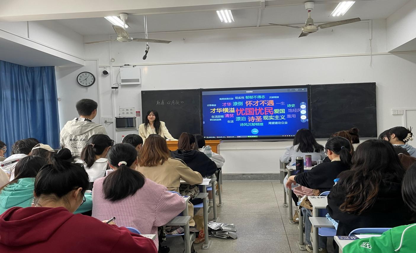 沈月以学生制作的《钗头凤》短视频导入课程,引出爱之忠贞的主题,通过提问“你心目中的杜甫形象”,引出杜甫痴情的特质;用自己制作的快闪作品《杜甫》介绍杜甫的一生和创作特点,最后落脚到对杜甫作品《月夜》的分析:对妻子的深情与爱之忠贞。沈老师上课落落大方、感染力强、课程氛围好。