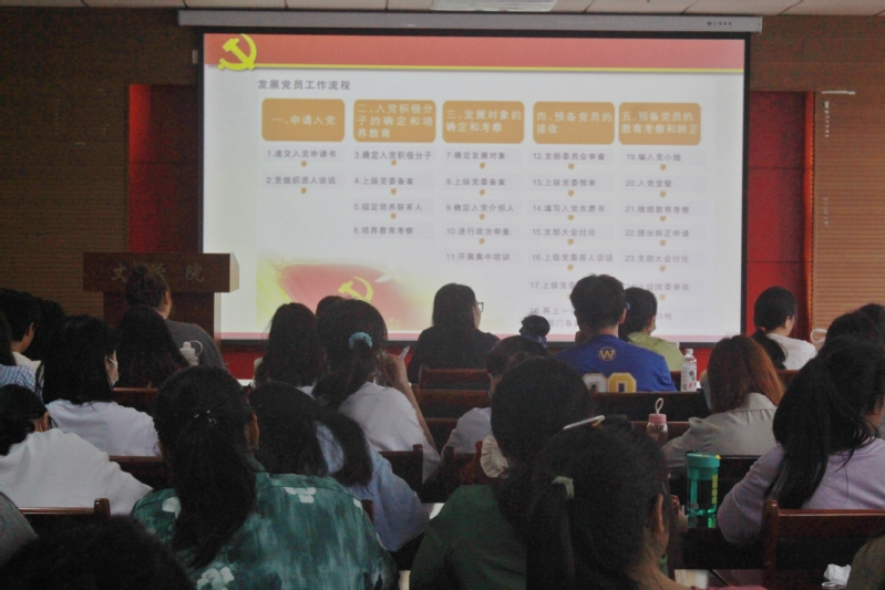 为进一步规范发展党员工作,帮助入党积极分子更好了解发展党员流程,提高党员发展质量,2022年4月24日下午,文学院于21A602会议室举行第二十八期入党积极分子培训班第三讲。文学院党委副书记陈敬道受邀担任主讲人,全体学员参训。
