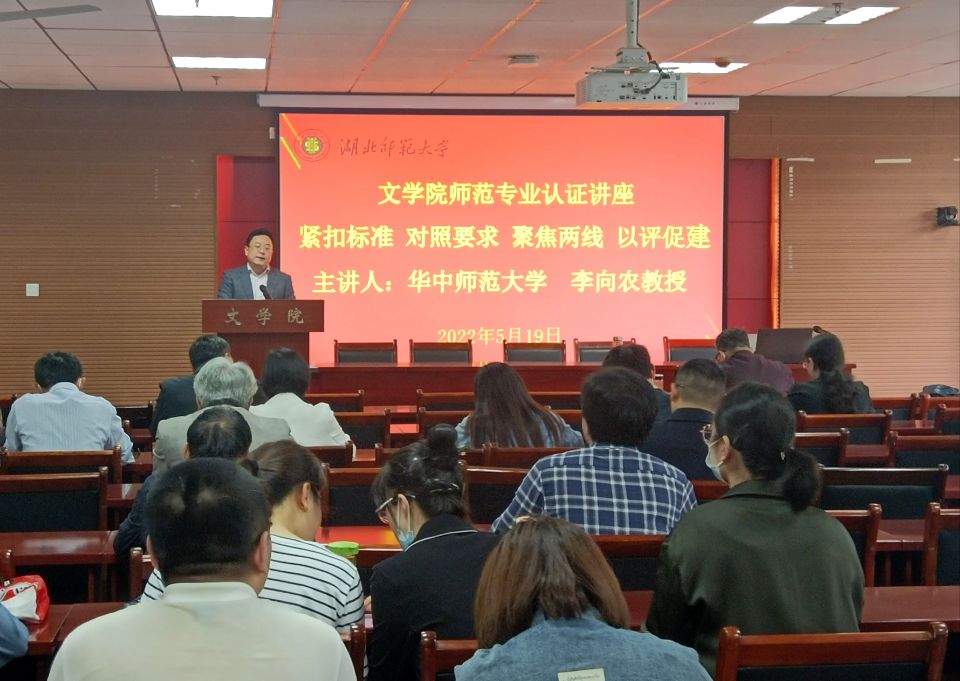 为了进一步践行“学生中心,产出导向,持续改进”师范类专业认证理念,深入了解师范类专业认证自评报告和支撑材料准备中的具体问题,对标对表,扎实推进师范类专业认证工作,2022年5月19日,文学院邀请原华中师范大学副校长李向农教授做专题辅导讲座。讲座由院长李治平主持,学院党政领导班子、全体教职工参加了讲座。