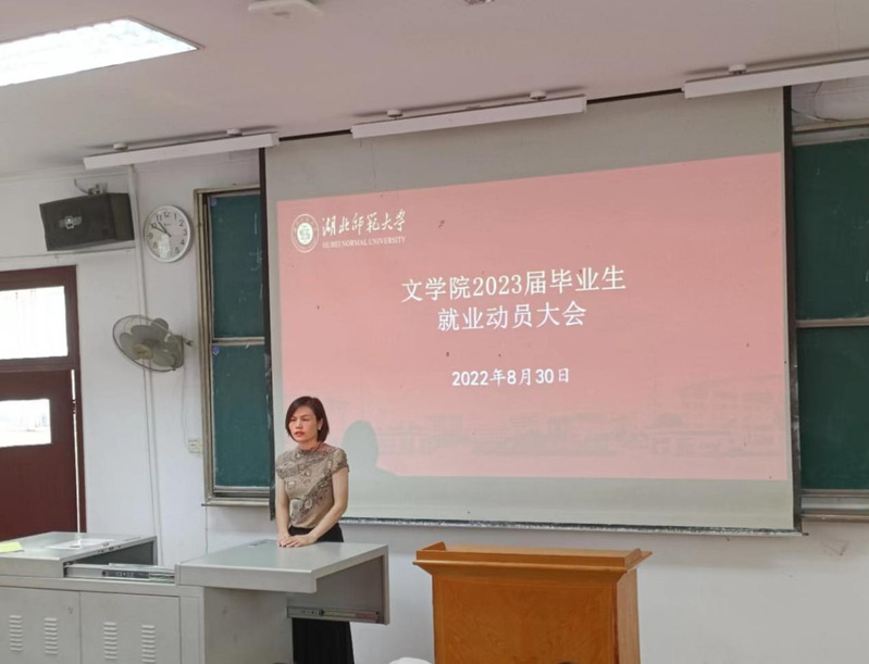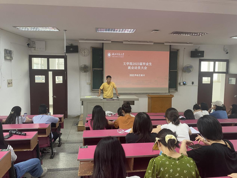 为做好2023届毕业生就业动员工作,引导毕业生树立正确的择业观和就业观,使毕业生充分了解当前就业形势,全方位做好就业准备,2022年8月30日上午,文学院召开2023届毕业生就业动员大会。学院党委副书记陈敬道,辅导员刘骏、邱天来、董雅芳,2023届全体在校毕业生参加会议。