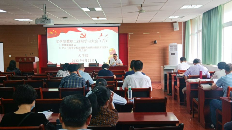 为贯彻落实第六版技术方案的新精神、新要求、新举措,提高学院在疫情防控中的应急处置能力,守护全院师生健康安全,2022年9月22日下午,文学院党委在学院602会议室召开疫情防控专题学习会议,专题学习《高等学校新冠肺炎疫情防控技术方案(第六版)》。学院党政领导班子成员、全体教职员工参加会议。会议由党委书记严志谷主持。