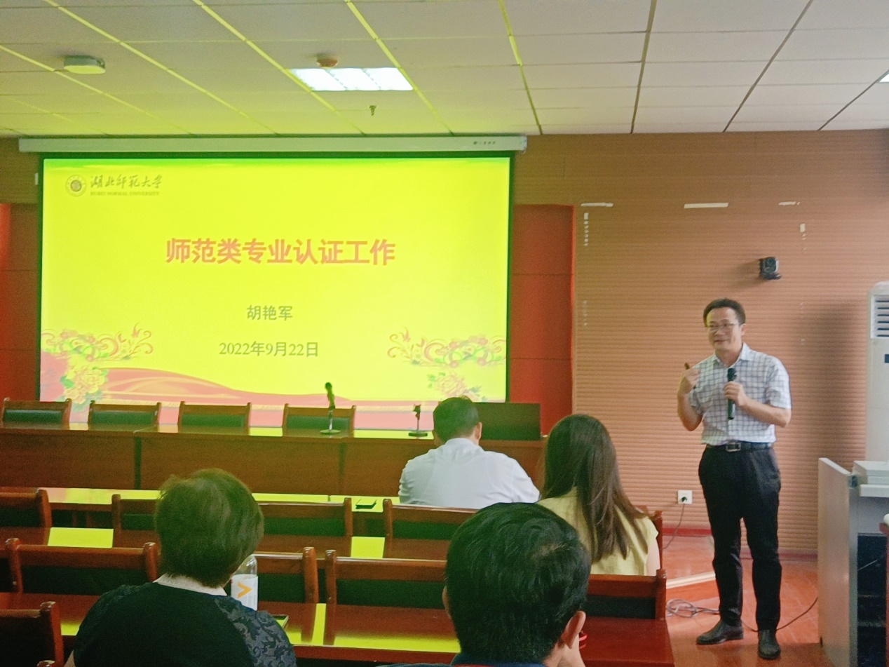 2022年9月22日下午,教育部师范专业认证专家,学校教务处处长胡艳军莅临文学院21A602会议室做“师范专业认证工作”专题指导报告。文学院党委书记严志谷、院长李治平以及全体教师参加报告会。
