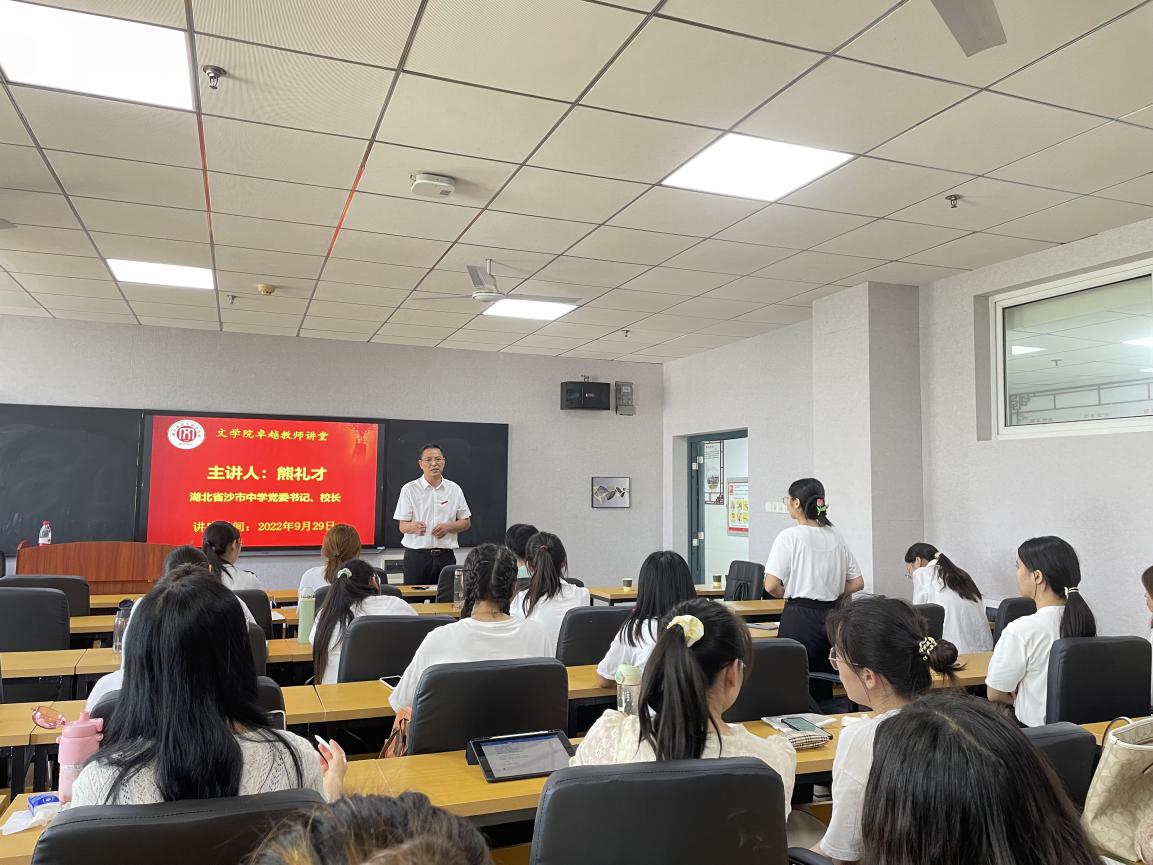 2022年9月29日,湖北省沙市中学党委书记、校长熊礼才荣归母校,在人文楼21A506为文学院研究生作了一场题为“中学语文教育的变与常”的学术报告。讲座由文学院副院长彭江浩主持,学科教学(语文)和语文课程与教学论专业学生到场聆听。