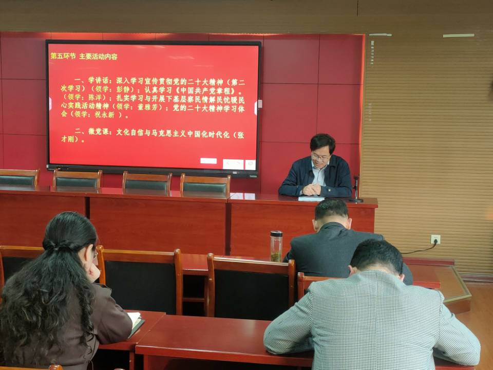为了深入学习宣传贯彻党的二十大精神,2022年11月17日下午,文学院在人文楼A-602学术报告厅举办了“学习二十大,奋进新征程”的十一月主题党日活动。会议由学院教师第二党支部书记彭静主持,全体党员参加了本次活动。