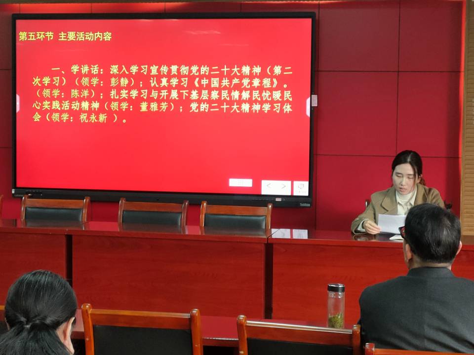 在学讲话的重要环节,彭静领学了深入学习宣传贯彻党的二十大精神(第2次学习),陈洋领学了认真学习《中国共产党章程》,董雅芳领学了扎实学习开展下基层察民情解民忧暖民心实践活动精神,祝永新领学了党的二十大精神学习体会。