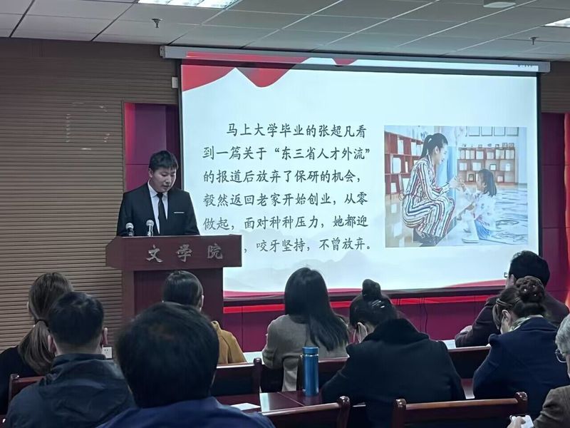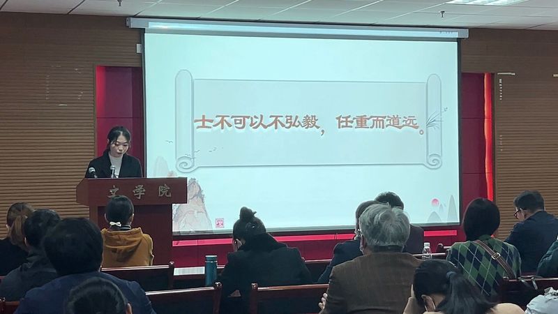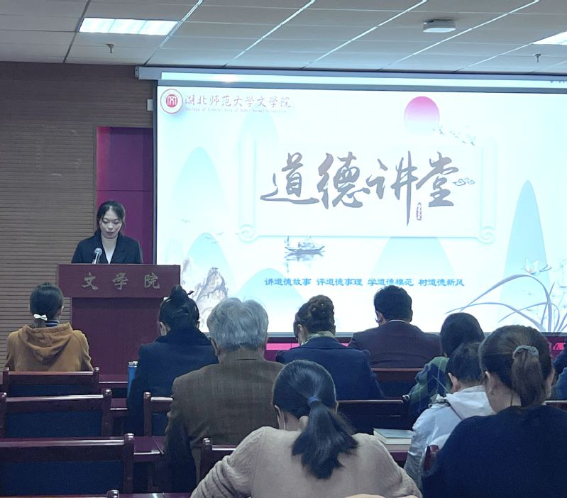 为宣扬助人为乐、见义勇为、诚实守信、敬业奉献和孝老爱亲的道德品质,激励文学院师生不断提升道德素养,构建成仁尚德的良好氛围。2022年11月24日下午,文学院联合教务处于人文楼21A602会议室开展“砥砺前行,笃行致远”道德讲堂。学院党政领导班子,教务处副处长周艳华、办公室主任廖煜,学院全体教师党员、学生党员代表及入党积极分子代表参加讲堂,讲堂由汉语国际教育专业2004班张梓谦主持。