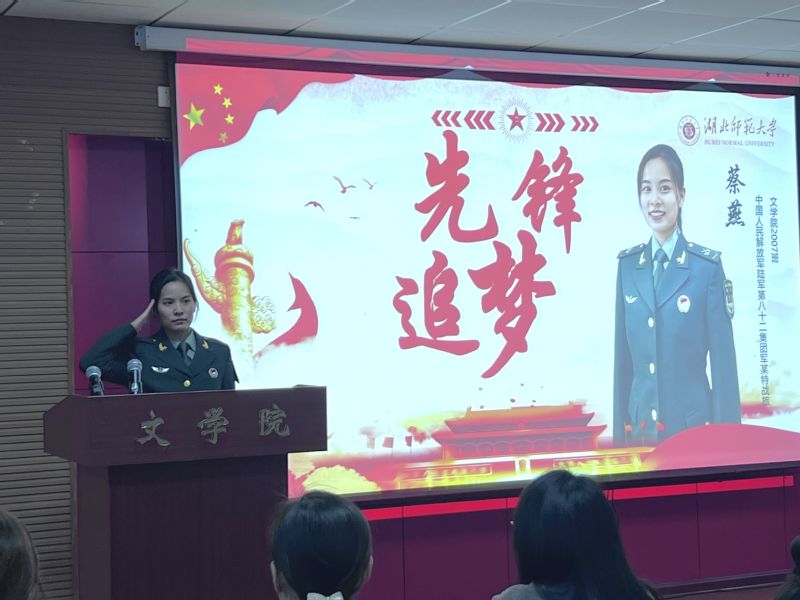 学生代表蔡燕分享了自己曾经的军旅生涯。她将自己的故事讲给更多的人听,将“永不言败”的女兵精神传递给更多的人。在蔡燕同学身上,师生学到了“不爱红妆爱武装,砥砺奋进献祖国”的坚定信念与无私奉献的精神。