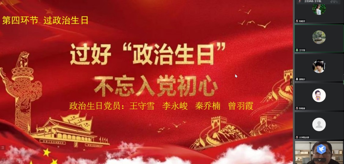 活动伊始,党员们线上交纳党费、诵读党章。“过政治生日”环节,王守雪、李永峻、秦乔楠、曾羽霞同志分别结合自身的生活工作经验,表达出不忘初心,牢记使命的意志和决心。本次“主题党日”的学讲话环节,首先由李洪亮同志领学深入学习宣传贯彻党的二十大精神(第三次学习);其次由曾羽霞同志领学深入学习《习近平谈治国理政》第四卷第五部分“统筹疫情防控和经济社会发展”;沈月同志领学《求是》杂志刊文《习近平:在党的十九届七中全会第二次全体会议上的讲话》。三位同志分别结合领学内容,谈了各自学习的心得体会。二支部书记彭静领学“持续深化落实‘一下三民’实践活动”相关内容。