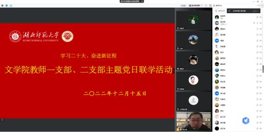 2022年12月15日下午,文学院教工支部在腾讯会议开展主题为“学习二十大、奋进新征程”的线上“主题党日”活动,本次活动由教师一支部书记祝永新同志主持。