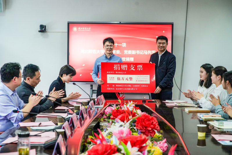 马列军代表学校接受何贞发捐赠。此次是何贞发继2012年捐赠6万元、2020年捐赠30.72万元之后,第三次向文学院捐款。三次捐赠累计金额41.72万元。