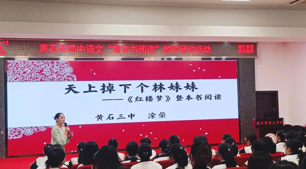 此次活动主题为“整本书阅读教学与研讨”,首先,黄石三中的涂荣老师带来示范课《天上掉下个林妹妹——<红楼梦>整本书阅读交流课》。她以“寻觅佳友”进行情境导入,播放相关视频,让同学们对比分析林黛玉的“小性儿”与“非小性儿”形象特征及原因,通过点拨引导,使学生对黛玉形象有了更加全面、立体的认识。涂荣还总结了整本书阅读的方法:阅读应自梳理始,理解终从细读出。