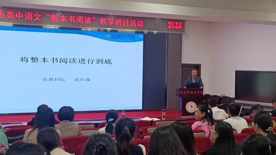 接着,湖北省教科院中学语文教研员、湖北省教育学会中学语文理事长蒋红森开展了《将整本书阅读进行到底》的讲座。蒋红森提出要提升对整本书阅读意义的认识,要通过“读什么”、“读完”、“回读”和“研后”交流四个环节组织和引导学生整本书阅读不断走向深入,强调教师要做学生阅读的示范者,做整本书阅读的研究者,主动担当读书环境建设者角色。