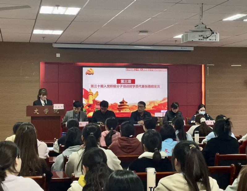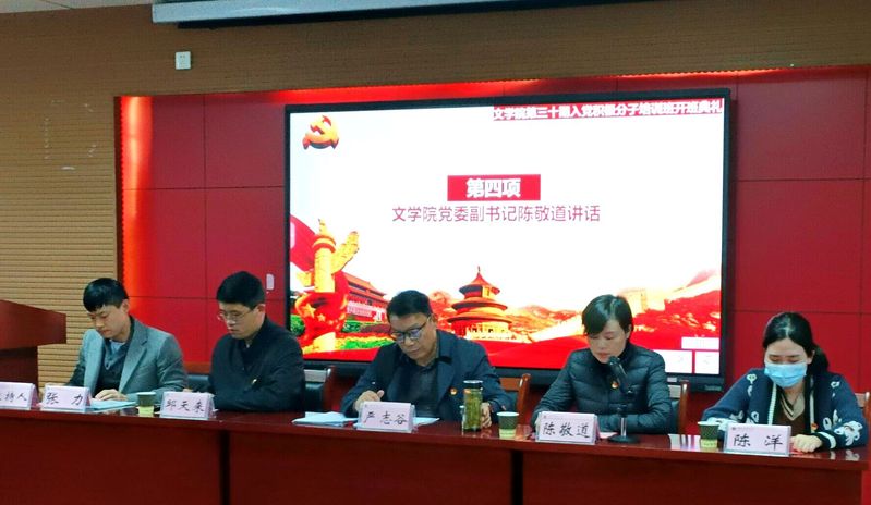 为学习宣传贯彻党的二十大精神,推动学习贯彻习近平新时代中国特色社会主义思想主题教育走深走实,切实加强对入党积极分子的教育与培养,2023年4月25日晚,文学院于人文楼21A602报告厅举办文学院分党校第30期(学校第66期)入党积极分子培训班开班典礼暨培训第一讲。文学院党委书记、分党校校长严志谷,党委副书记陈敬道,学生第二、三党支部书记邱天来、陈洋,辅导员董雅芳以及64名培训班学员参加典礼。活动由学生第一党支部书记、培训班班主任张力主持。