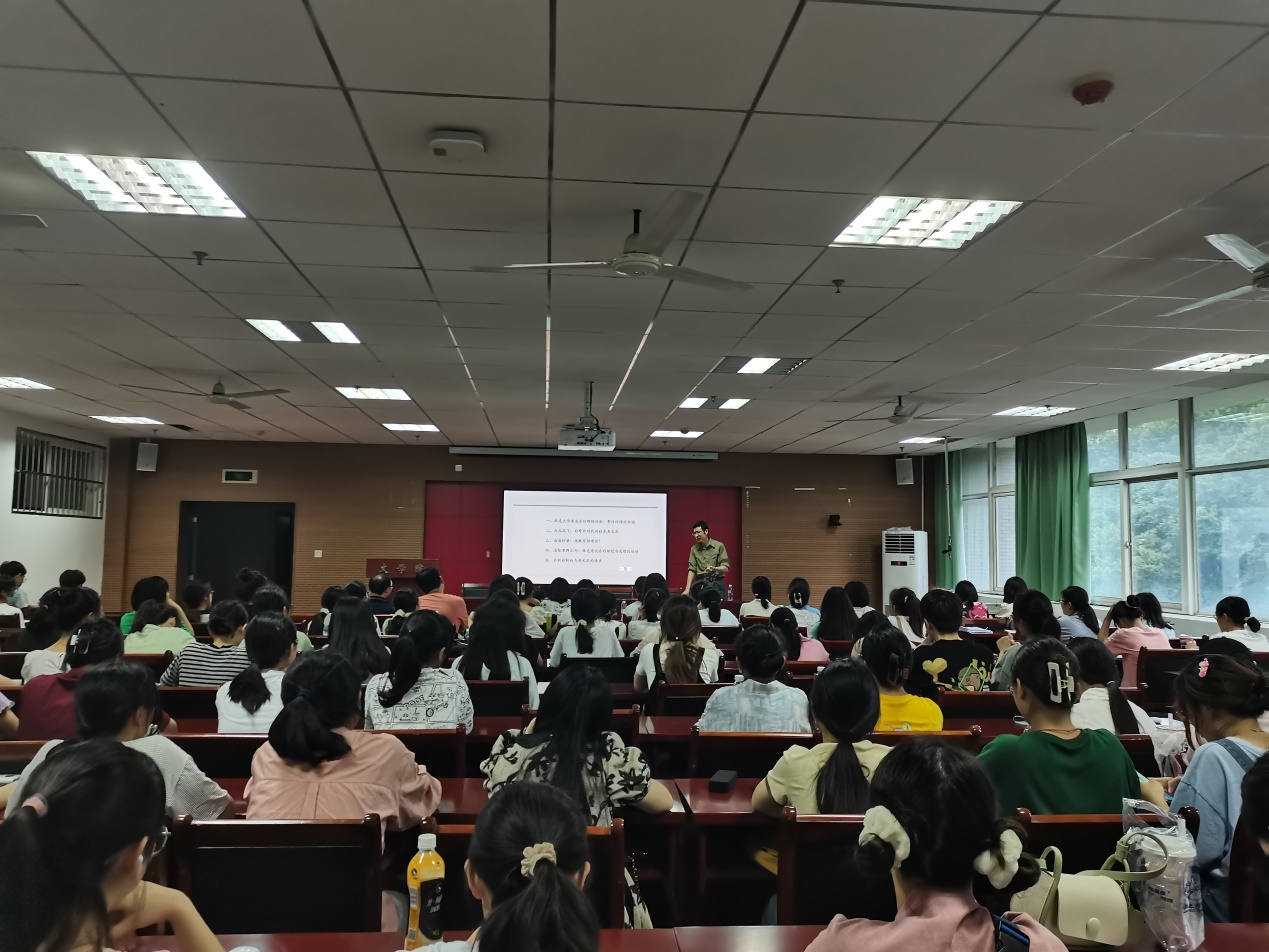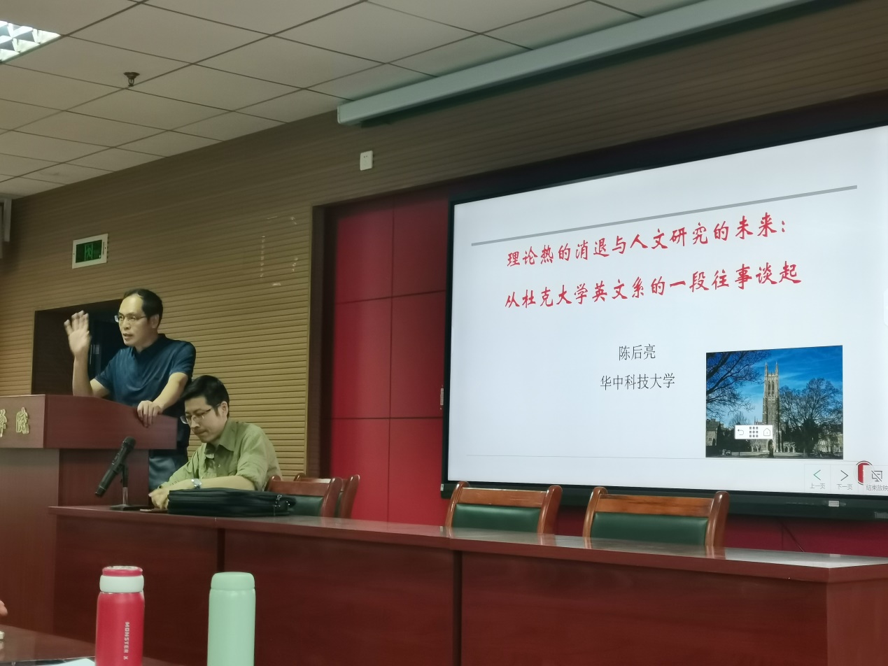 2023年5月18日晚,华中科技大学陈后亮教授作客我校50周年校庆系列学术报告会,为文学院师生作题为“理论热的消退与人文研究的未来——从杜克大学英文系的一段往事谈起”的专题学术报告。本次会议由文学院李有光教授主持,会议在人文楼A座602报告厅开展。前来听讲的师生众多,全场座无虚席。