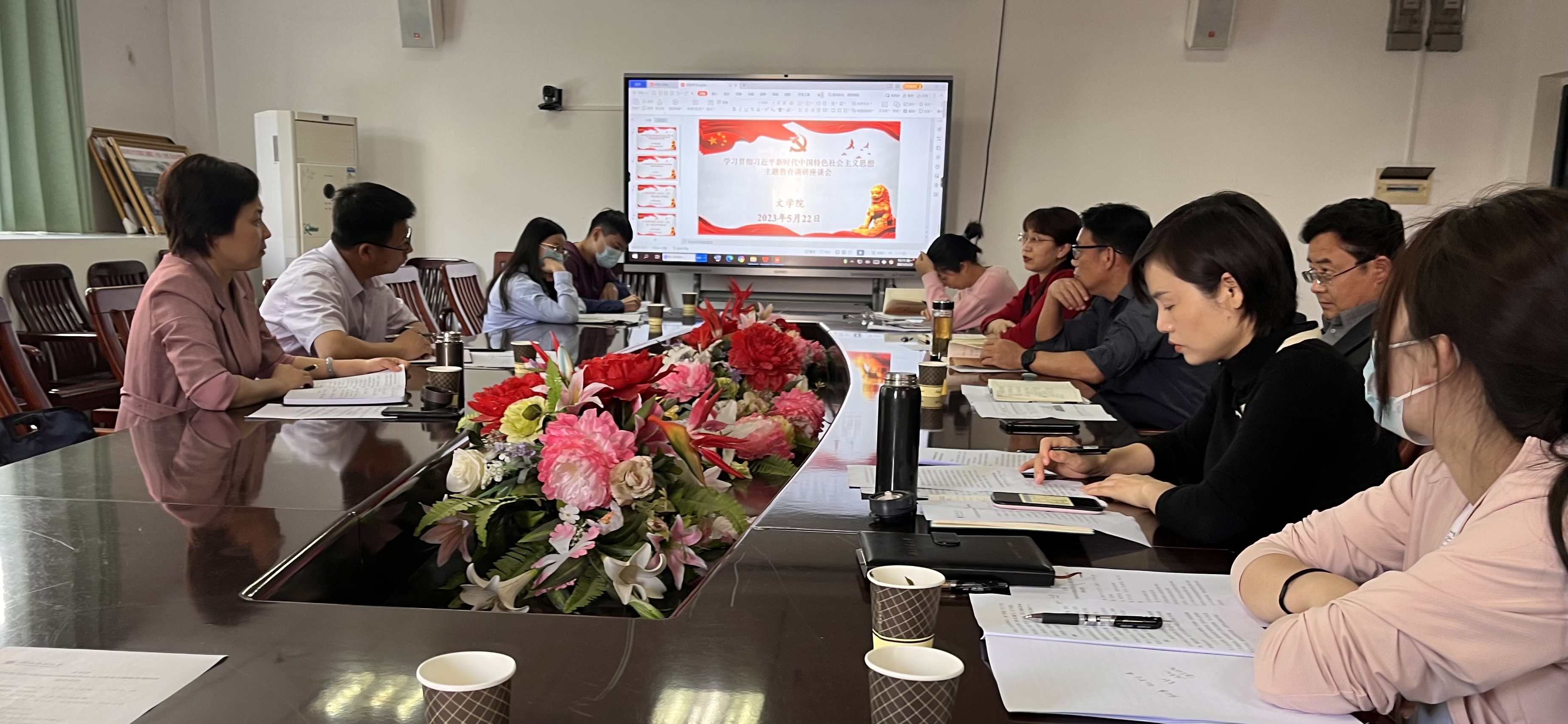 2023年5月22日下午,校党委常委、纪委书记、监察专员陆咏梅专程到文学院开展学习贯彻习近平新时代中国特色社会主义思想主题教育调研座谈会。调研座谈会在人文楼A-505会议室举办,校纪委、监察专员办公室纪检监察室主任王新忠和文学院班子成员、系主任、党支部书记、四办主任参加会议,会议由陆咏梅主持。