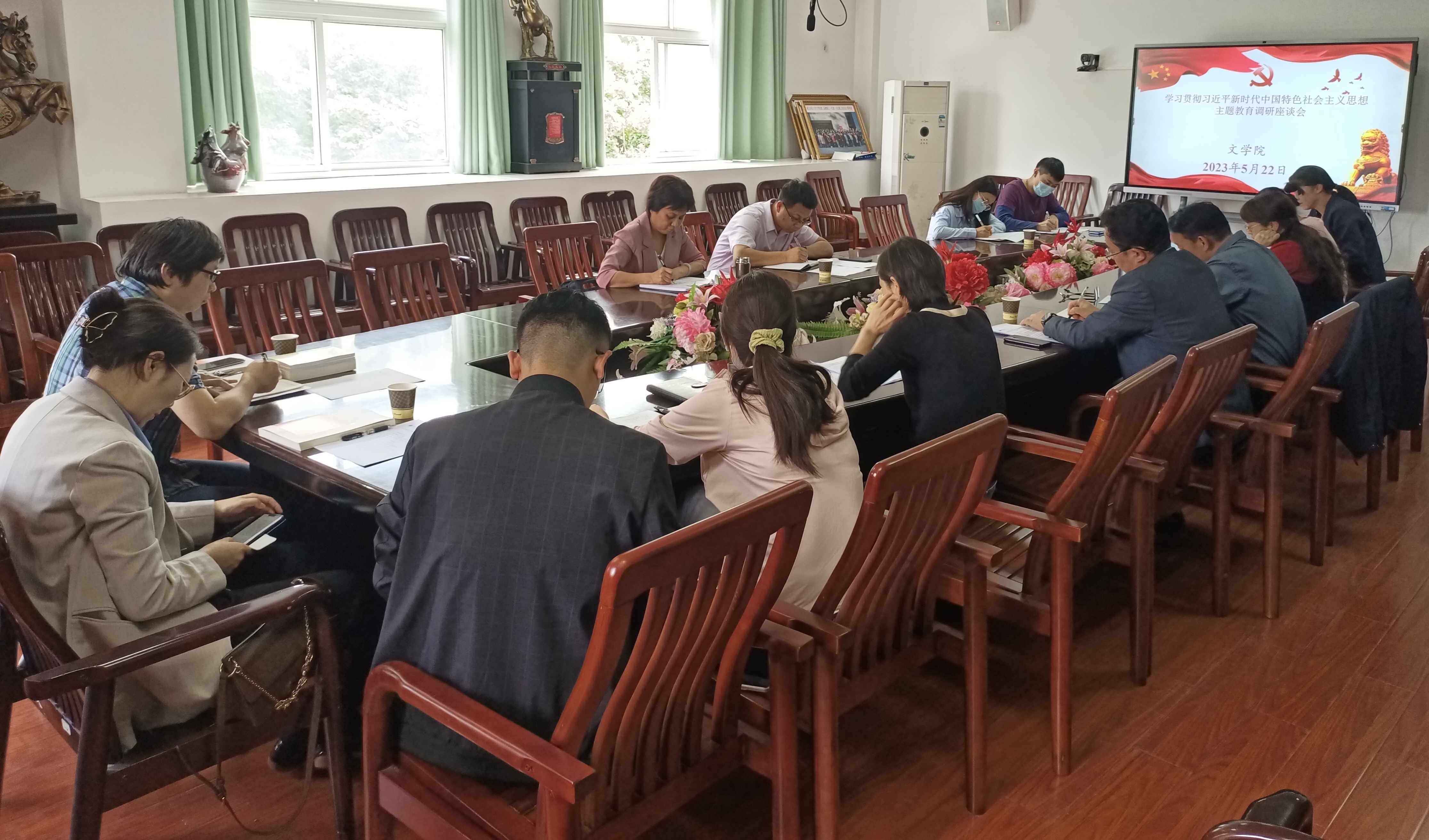 2023年5月22日下午,校党委常委、纪委书记、监察专员陆咏梅专程到文学院开展学习贯彻习近平新时代中国特色社会主义思想主题教育调研座谈会。调研座谈会在人文楼A-505会议室举办,校纪委、监察专员办公室纪检监察室主任王新忠和文学院班子成员、系主任、党支部书记、四办主任参加会议,会议由陆咏梅主持。