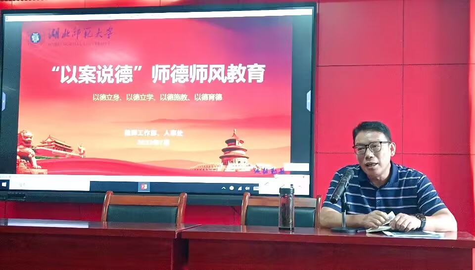 本次大会由院党委书记严志谷主讲:一、师德师风教育。学院党委常抓不懈,专题会、警示会、谈话会相互联动。本次“以案说德”是继6月15日的第一场后的第二场,严志谷再次领学了新时代师德师风建设的相关要求、相关文件内容并对教育部公共曝光的第十一批7起违反教师职业行为十项准则典型案例进行了警示学习,着重强调广大教师要切实做到以德立身、以德立学、以德施教、以德育德。二、党风廉政建设宣教月工作。全院师生必须严格按照湖师党【2023】28号“关于印发《湖北师范大学2023年党风廉政建设宣传教育月活动方案》的通知”要求积极行动起来,突出活动主题“加强纪律教育培养纪律自觉”,按时圆满完成学院应承担的各项任务。三、教职工集中廉政从教谈话。严志谷要求全院教职工应严肃认真地做到(一)践行初心、担当使命,真心立德、潜心教书、全心育人;(二)遵纪守法、循规蹈矩,知敬畏、存戒惧、守底线,党员干部廉洁从政、专任教师廉洁从教。四、主题教育开展。学院党委自4月起,学习贯彻习近平新时代中国特色社会主义思想主题教育,有专班、有方案、有要求,组织得力、学习扎实、时间保障、成绩显著,目前读书班已结班;下一步,将按照上级要求不折不扣深入开展。五、暑期重点工作。(一)主题教育材料汇总(二)调研报告形成(三)师生支部党建工作上半年总结、下半年计划(四)在岗在籍师生党员信息核实整理(五)就业与招生(六)值班安排与留校学生安全(七)学生社会实践与家访活动(八)校友返校与校友捐赠等等。