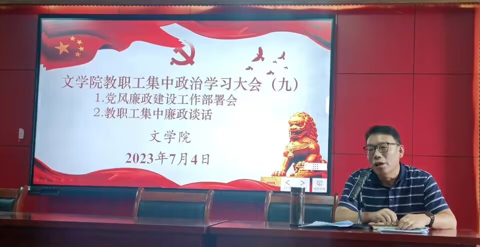 2023年7月4日下午,文学院党委于人文楼A-602学术报告厅召开本学期第九次教职工集中政治学习大会,本次大会共有五项内容:1.“以案说德”师德师风教育(二);2.文学院2023年党风廉政建设宣传教育月工作部署;3.教职工集中廉政从教谈话;4.学院主题教育开展情况通报;5.暑假重点工作安排。会议由党委委员、院长李治平主持,全院教职工参加大会。