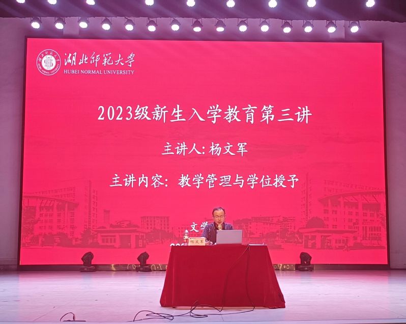 为帮助2023级新生尽快适应大学的学习生活,顺利完成角色转变,明确学习目标,2023年9月12日晚,文学院于湖师大礼堂开展2023级新生入学教育第三讲。此次讲座由文学院副院长杨文军主讲,党委副书记郭笑笑主持,2023级全体新生参与。