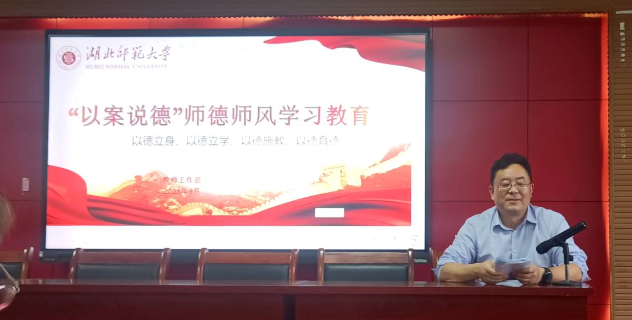 2023年9月21日下午,文学院党委于人文楼A-602学术报告厅组织开展“以案说德”师德师风学习教育活动,全体教职工参加、院党委书记严志谷主持、院长李治平主讲。