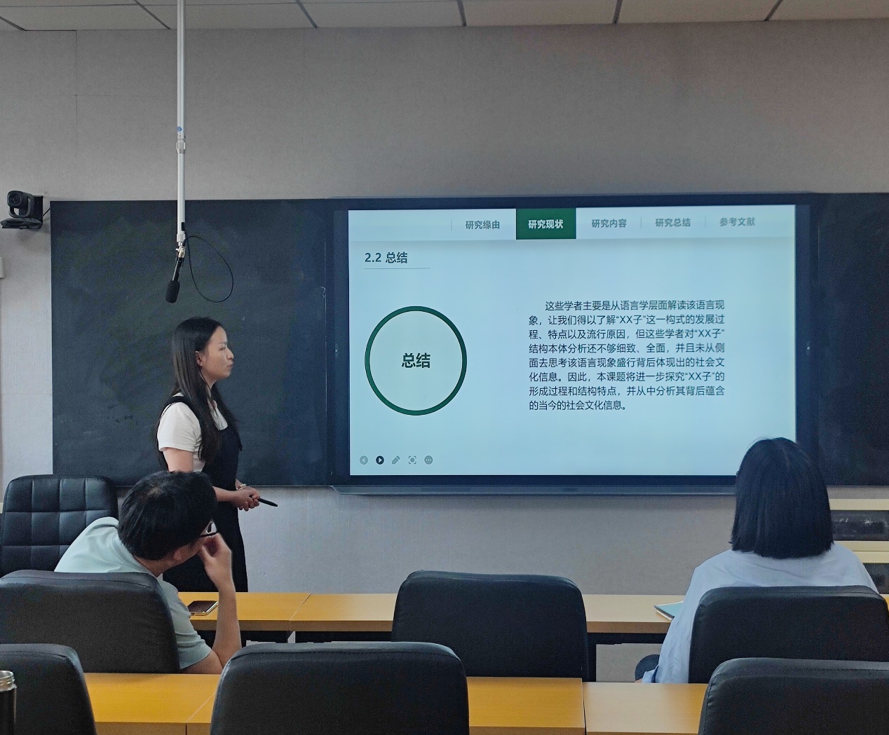 在汇报过程中,老师们对学生所做的汇报内容提出了一些建议:首先,是在研究过程中要多关注当代学术前沿的研究成果,选择一些经典的、有权威的作品阅读,参考文献不能太陈旧,研究的范围也不可太宽泛;同时也为学生推荐了一些相关的阅读文献,帮助学生拓宽阅读面,避免自己所认为的创新点与前人的研究重复。其次,对于研究,要有扎实、充分的论据证明,不可凭借猜测和感觉来做研究,结论要能够被大众所认可。