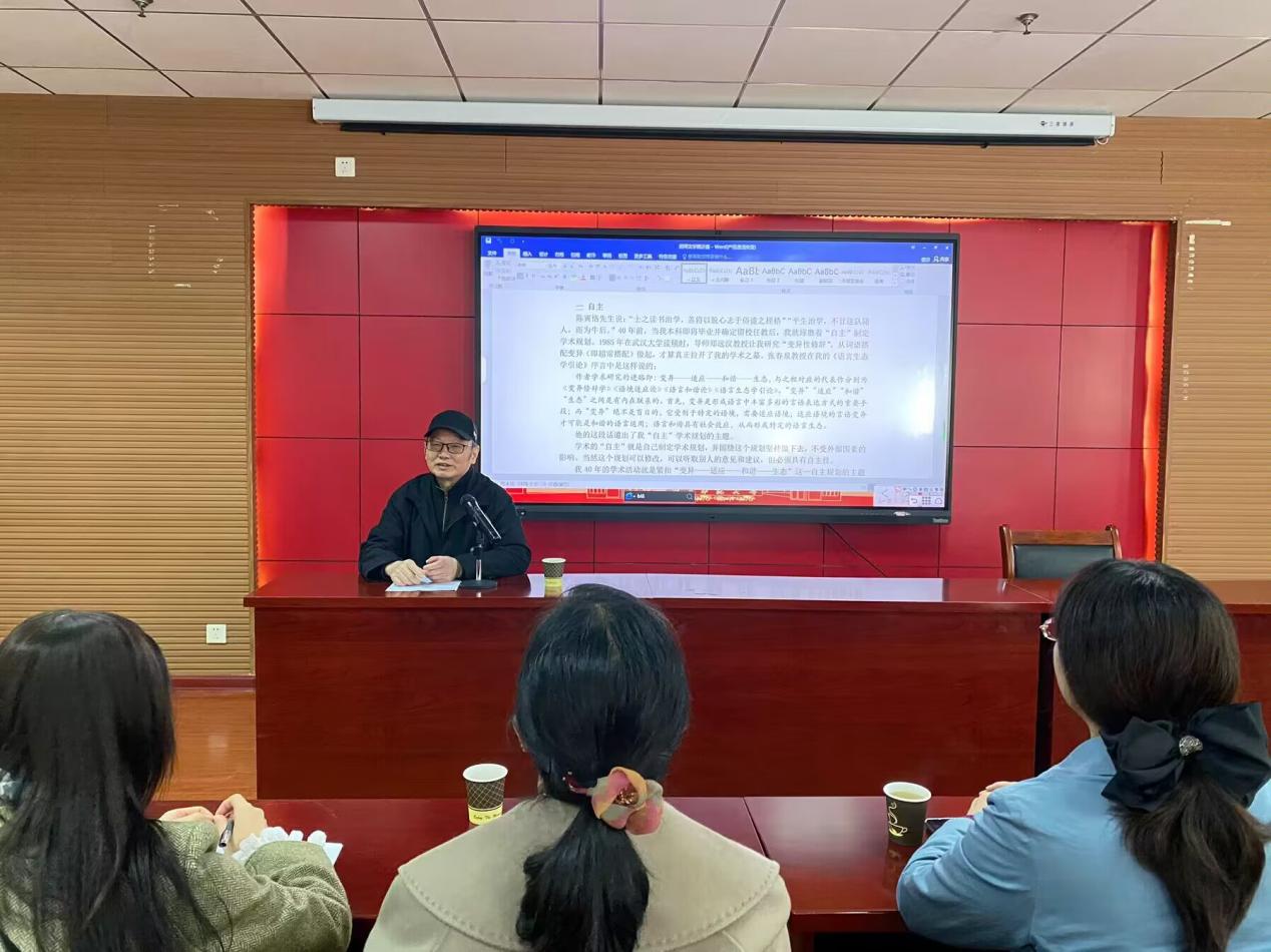 报告伊始,李治平对冯广艺教授作了简要介绍,冯广艺教授深情回顾了自己求学和工作的经历,并引用陈寅恪先生“士之读书治学,盖将以脱心志于俗谛之桎梏”“平生治学,不甘逐队随人,而为牛后”的话作为开场白。随后,冯广艺教授从学术研究的“自主、自信、自洽、自律”四个方面展开详细论述:“自主”是自己制定学术规划,并围绕这个规划坚持做下去,不受外部因素的影响;“自信”属于四个自信中“文化自信”的范畴,个人的学术自信应该融入时代的滚滚大潮之中;“自洽”对学术界而言,是学术研究理论、观点和方法的一致性或统一性,对个人而言,则意味着不忘初心,始终如一;“自律”指遵守学术规范,强调合作精神,不断充实自己,坚持学术创新。讲座尾声,冯广艺教授结合自己四十多年来所积累的学术经验,与在场师生互动交流,回答了同学们提出的诸多问题,现场气氛活跃。