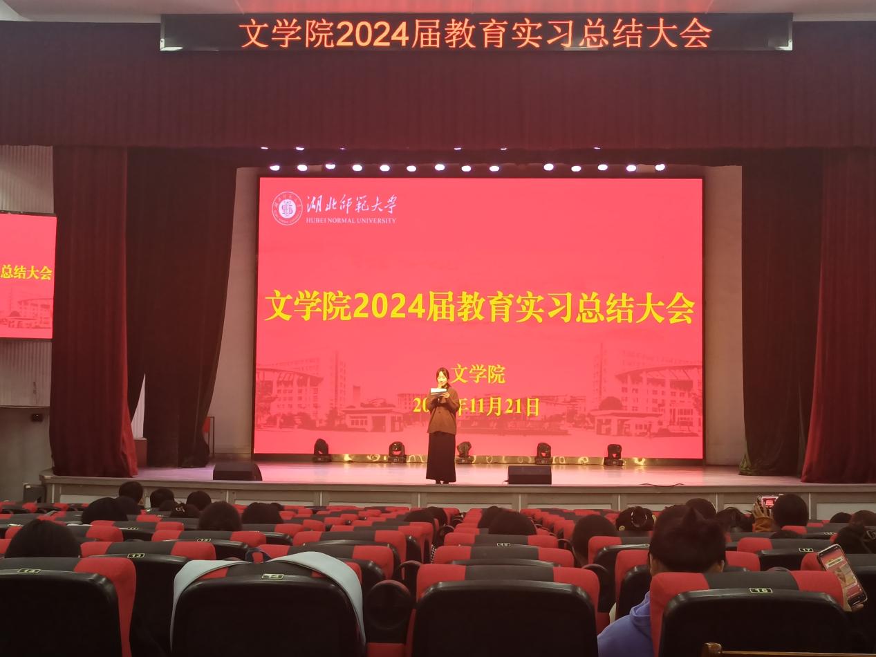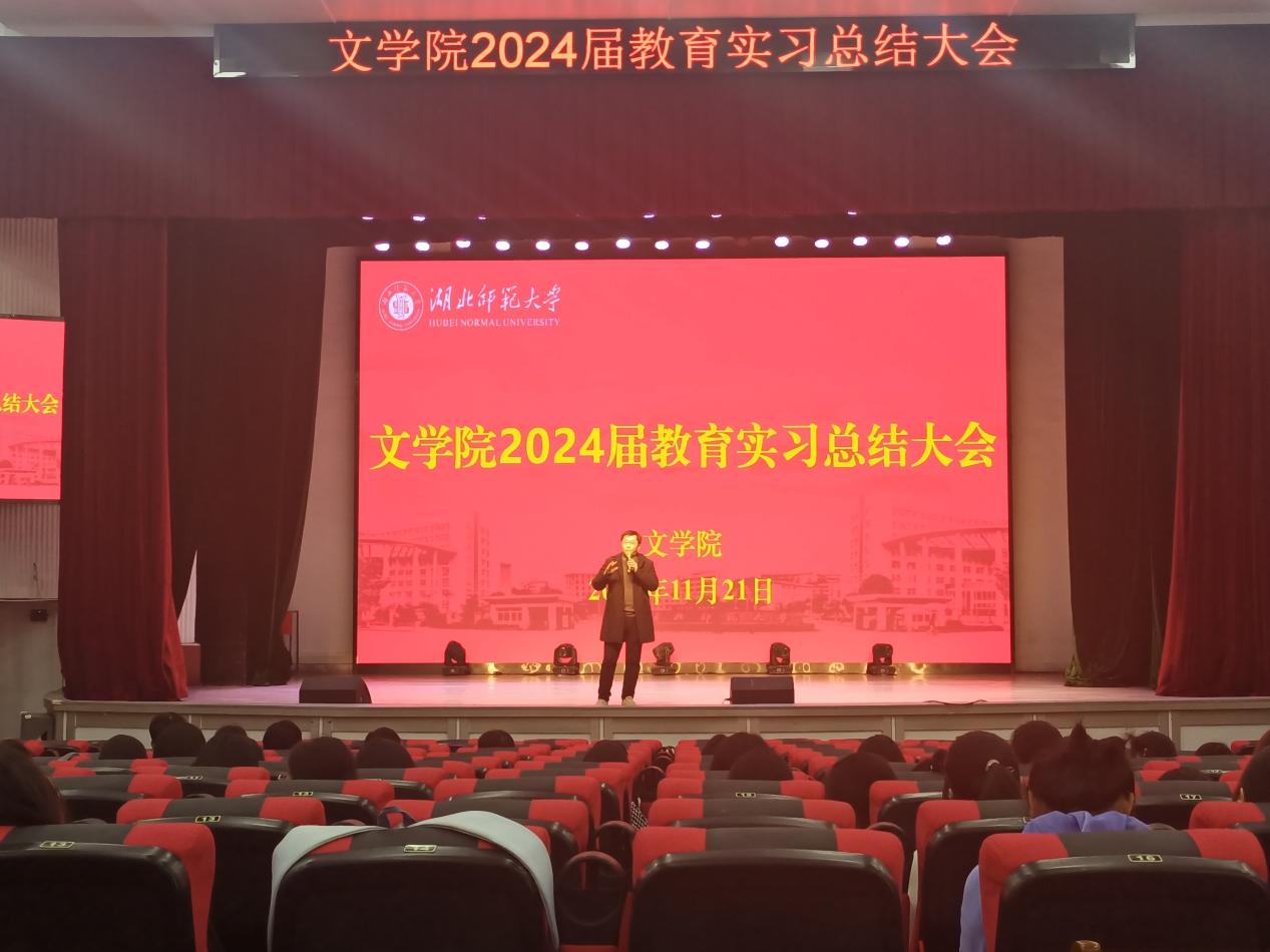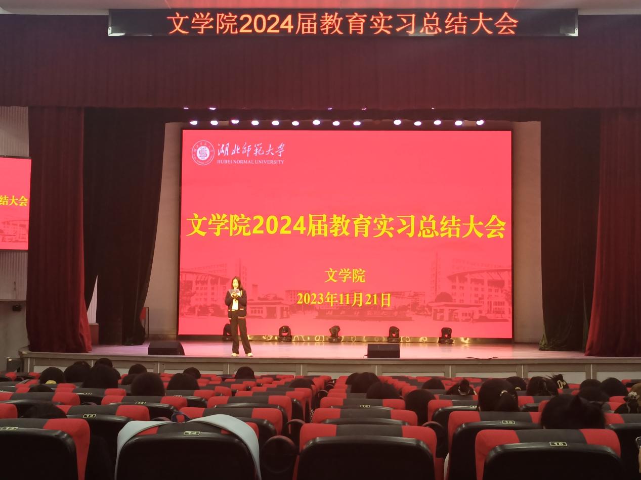 为进一步提高人才培养质量、扎实做好师范生教育实习工作,2023年11月21日下午,文学院在湖师大礼堂召开2024届师范生教育实习总结大会。中文系系主任祝永新、教学秘书夏晓庆以及2024届全体师范生参加会议。