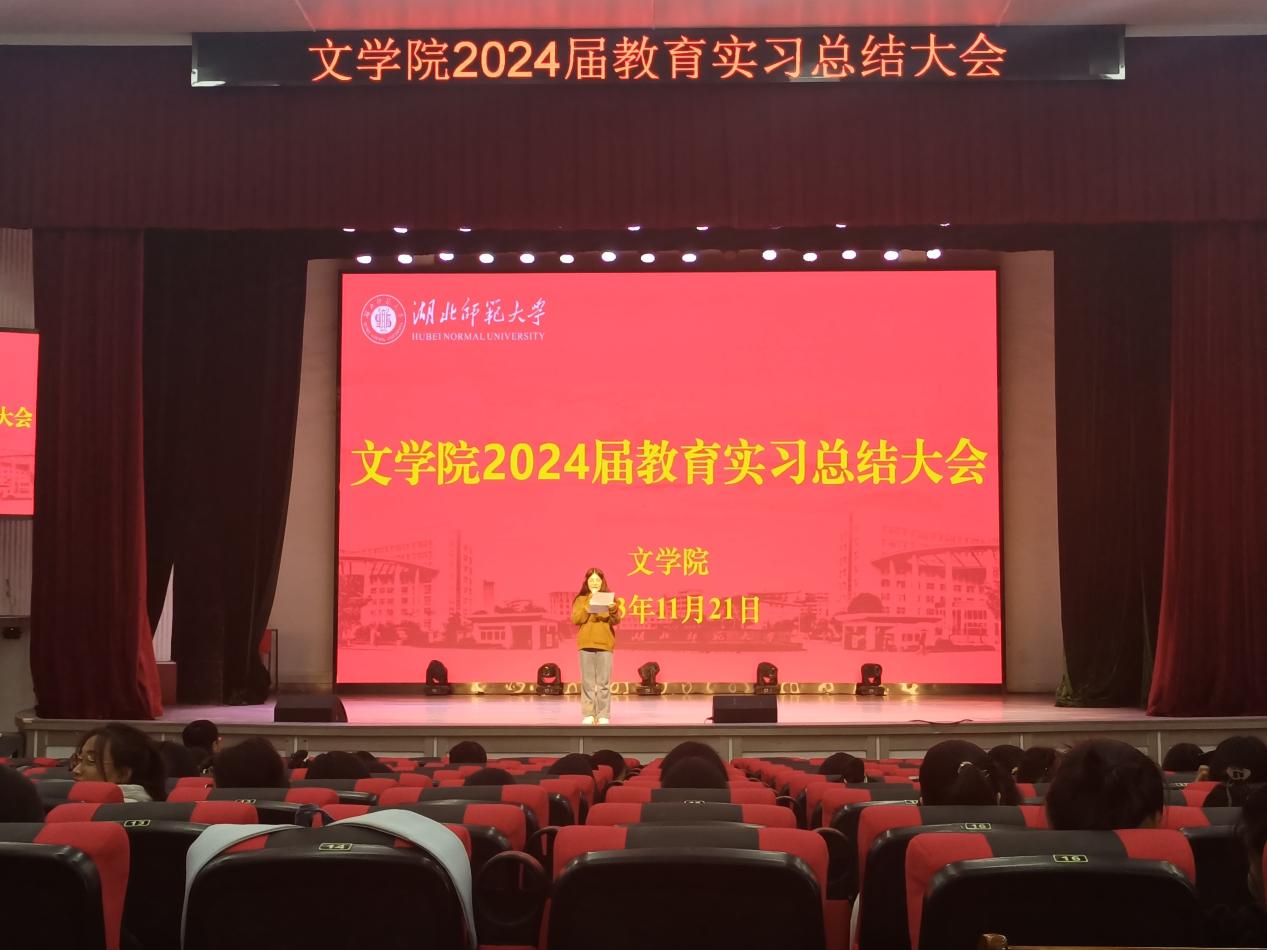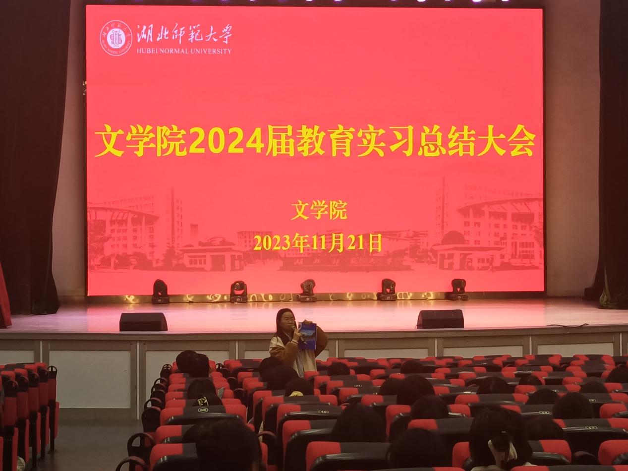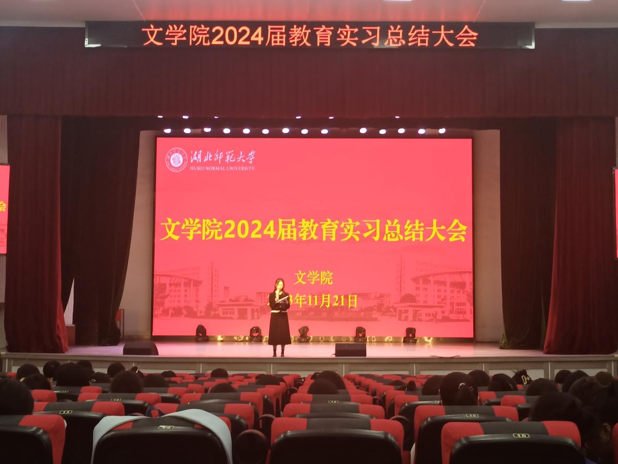 为进一步提高人才培养质量、扎实做好师范生教育实习工作,2023年11月21日下午,文学院在湖师大礼堂召开2024届师范生教育实习总结大会。中文系系主任祝永新、教学秘书夏晓庆以及2024届全体师范生参加会议。