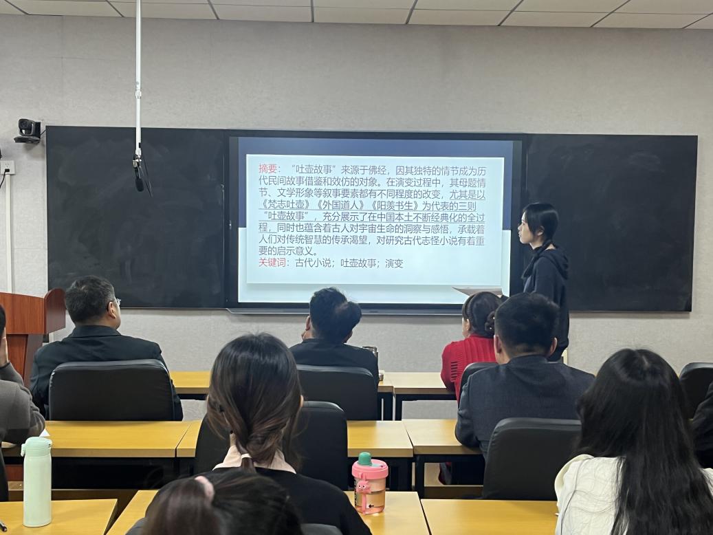 第四位龚子妮同学详细介绍了论文《“吐壶故事”的文本演变与文化分析》的选题背景及研究思路,她认为“吐壶故事”来源于佛经,因其独特的情节成为历代民间故事借鉴和效仿的对象。在演变过程中,其母题情节、文学形象等叙事要素都有不同程度的改变,尤其是以《梵志吐壶》《外国道人》《阳羡书生》为代表的三则“吐壶故事”,充分展示了在中国本土不断经典化的全过程,同时也蕴含着古人对宇宙生命的洞察与感悟,承载着人们对传统智慧的传承渴望,对研究古代志怪小说有着重要的启示意义。