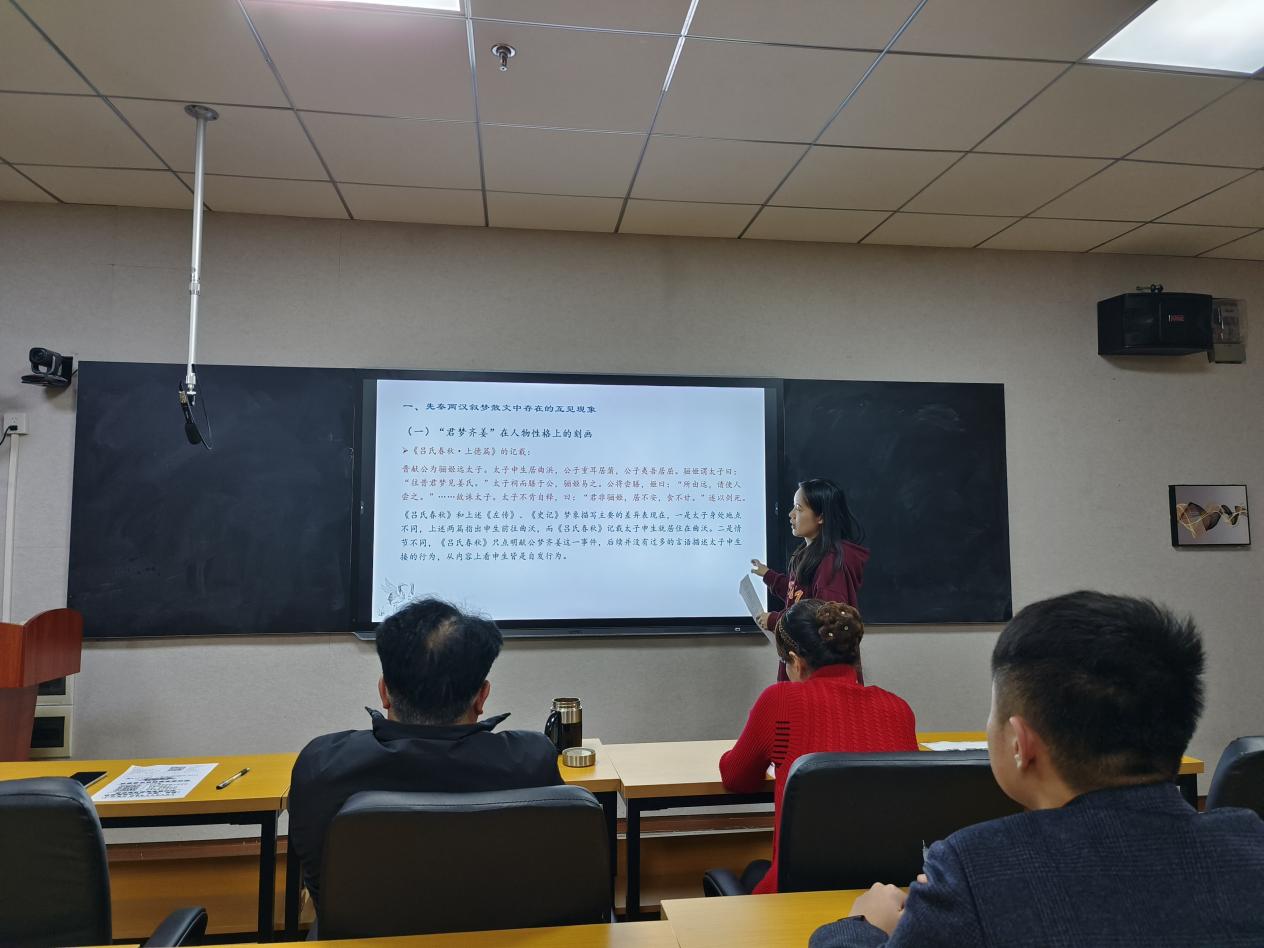 第二位作报告的同学是王晋宇,其论文题目是《战国策对苏轼散文的影响》,他认为,宋代与战国时期复杂的社会环境有一定的相似性。宋代社会矛盾突出,战国诸侯纷争之势刺激了士人评论政治问题,向朝廷献策的行为,也就为《战国策》在宋代的接受提供了合适的环境。《战国策》对宋代诸多文人的创作均产生深刻影响,以三苏最为代表。从苏轼散文对《战国策》的接受探究、思想的接受、艺术风格的接受三个方面进行了探讨。