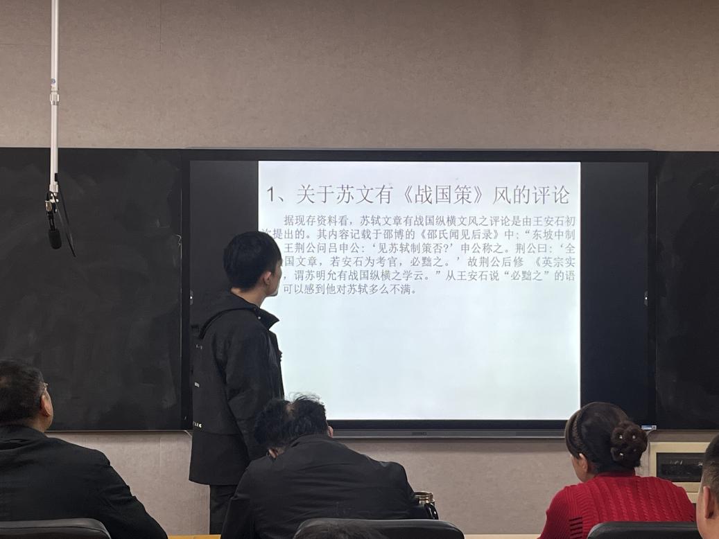第二位作报告的同学是王晋宇,其论文题目是《战国策对苏轼散文的影响》,他认为,宋代与战国时期复杂的社会环境有一定的相似性。宋代社会矛盾突出,战国诸侯纷争之势刺激了士人评论政治问题,向朝廷献策的行为,也就为《战国策》在宋代的接受提供了合适的环境。《战国策》对宋代诸多文人的创作均产生深刻影响,以三苏最为代表。从苏轼散文对《战国策》的接受探究、思想的接受、艺术风格的接受三个方面进行了探讨。