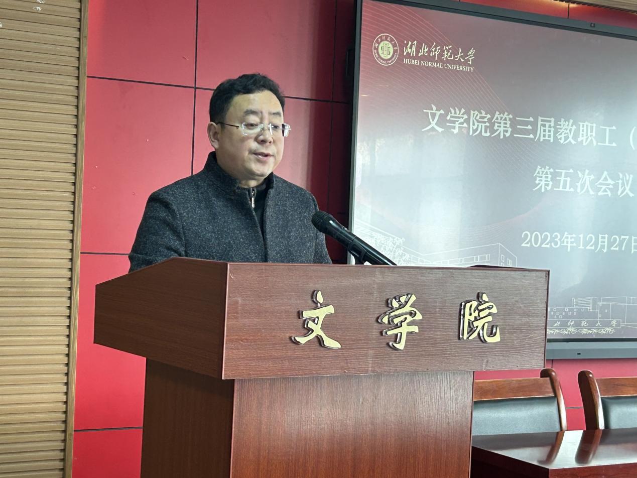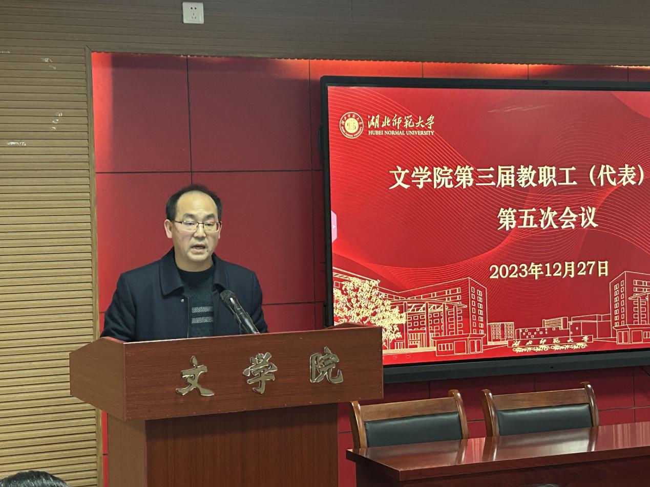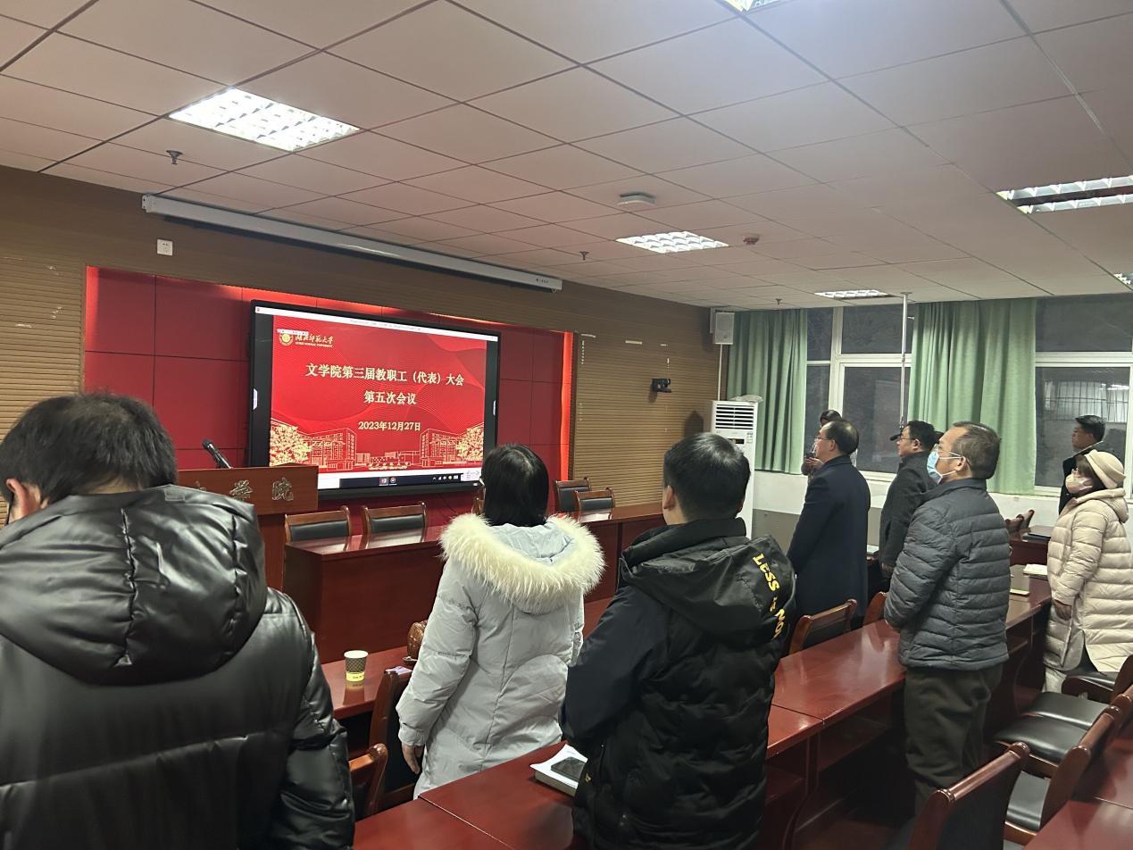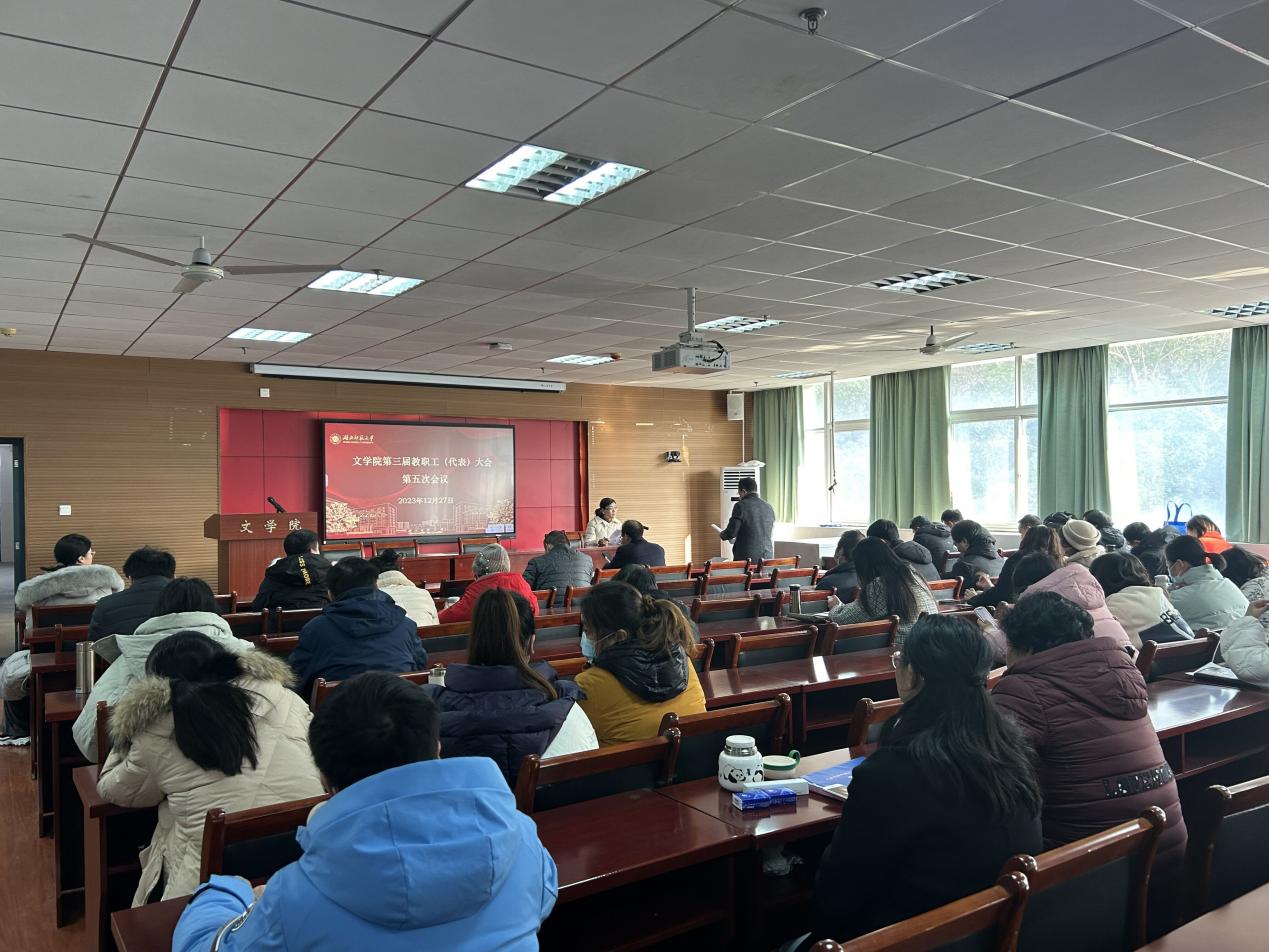 2023年12月27日下午,文学院第三届教职工(代表)大会第五次会议在人文楼21A602召开。文学院全体教职工参加会议。会议由学院党委副书记郭笑笑主持。