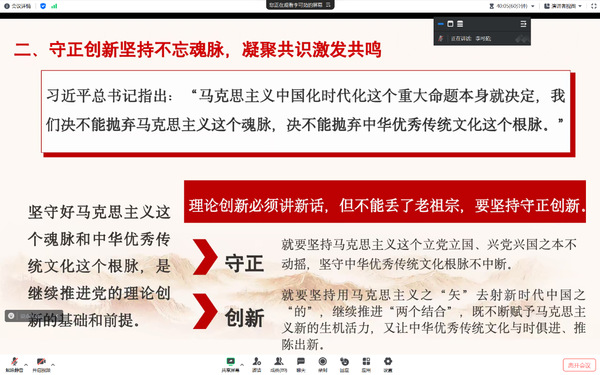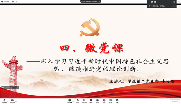 微党课环节,由学生第一支部孙小雨,第二党支部李可茹,第三支部文晶同志讲授“深入学习习近平新时代中国特色社会主义思想,继续推进党的理论创新” 主题微党课。他们提到,要坚持正确的政治方向,把握其中的党性原则、党性要求,同时进行有深度的学术分析,使其具有更深厚的学理支撑。加强思想引导和理论辨析,自觉抵制错误思潮,在重大原则问题和大是大非面前,立场坚定,旗帜鲜明,敢于亮剑,敢于发声,弘扬主旋律,传递正能量。