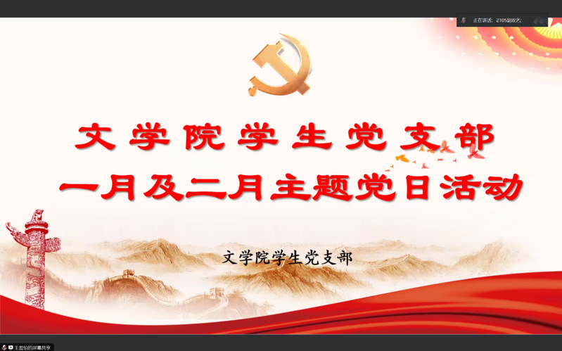 为深入学习贯彻习近平新时代中国特色社会主义思想和党的二十大精神,2024年2月28日下午,文学院学生第一二三党支部于线上“腾讯会议”开展以 “凝心聚力启新程,争先实干谱新篇”为主题的一、二月主题党日暨政治理论学习活动。