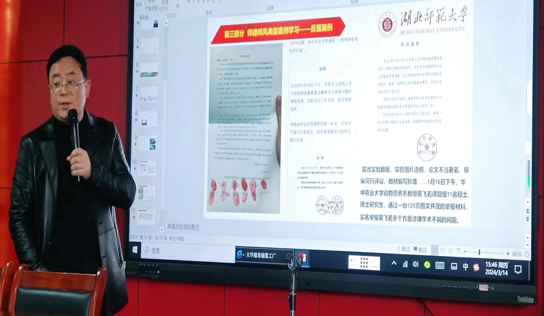 首先,院长李治平领学习近平总书记关于师德师风建设的重要论述,学习习近平关于教育的重要论述后,李治平强调,教师要有务实的学风与作风,关爱学生,将“立德树人”四个字牢记心间,践行师德,崇尚学术,追求卓越。接着,李治平带领大家学习我校2023年“湖北建行张富清尊师重教公益基金”高校优秀教师江超事迹。最后,李治平介绍了武汉某高校张某某生活作风问题和华中农大教授黄某某学术不端行为造成的恶劣社会影响,要求教职工以负面典型案例警示自己,向正面典型学习。李治平还要求全院教职工,要把立德树人内化到学院建设和管理各领域、各方面、各环节,争做师德师风先进个人。