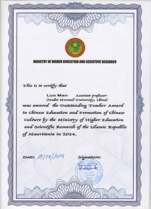 近年来,我院先后派出7名教师和30余名志愿者赴世界各地参加国际中文教学和中国文化传播,多名教师荣获国内外相关机构颁发的荣誉。罗曼老师此次获得表彰,既是我院教师投身国际中文教育事业,践行构筑人类命运共同体的生动体现,也是我国在“一带一路”倡议背景下对外文化交流的成果之一,以及我国与毛里塔尼亚两国深厚友谊的反映。