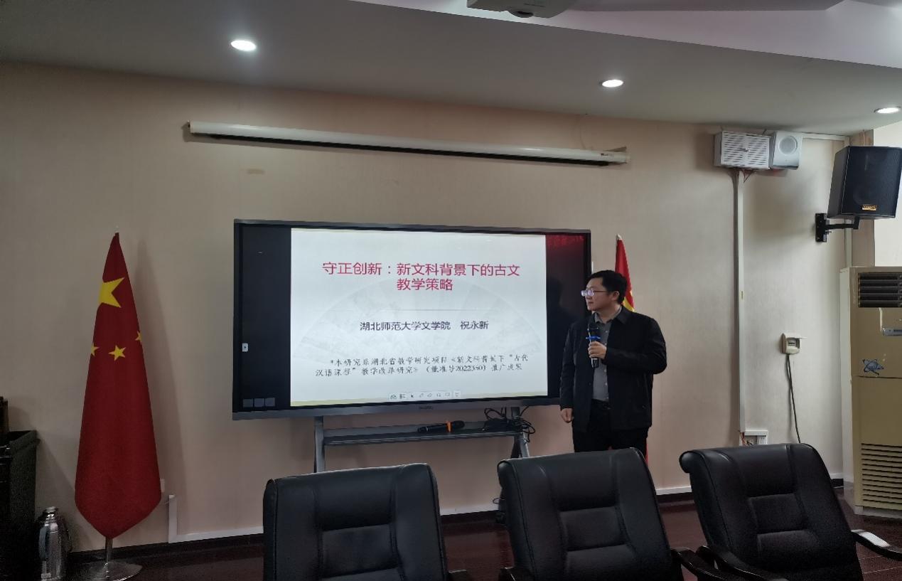 为有效促进教学改革研究项目成果的推广转化,加强与基础教育一线的交流,2024年4月25日下午,文学院中文系主任祝永新、语文课程与教学论教研室主任常璐等老师赴黄石市第二中学开展了以《守正创新:新文科背景下的古文教学策略》和《对分课堂—中国教育的新智慧》为主题的湖北省教学改革研究项目成果推广讲座。本次活动由“肖雨荻名师工作室”导师朱青松主持,黄石二中全体语文教师和实习教师参加。