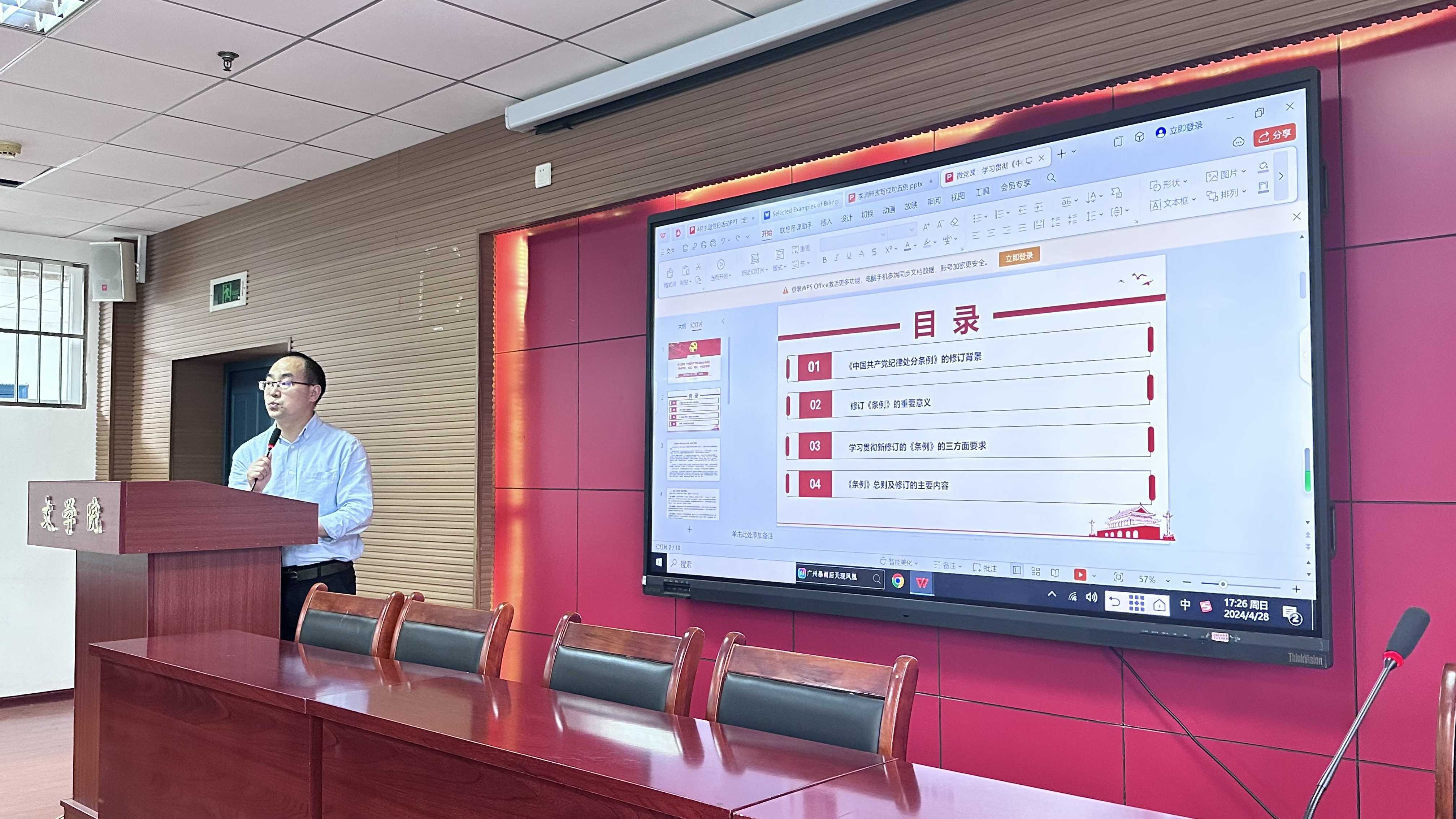 2024年4月28日下午,文学院教工一支部与教工二支部在21A602会议室召开全体党员大会,组织开展题为“严守纪律与规矩 树牢总体国家安全观”的主题党日活动,活动由第一支部书记王路成同志主持。