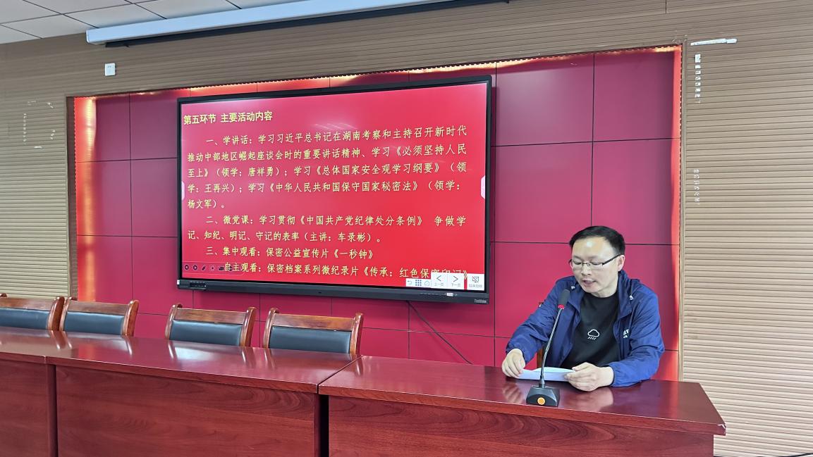 学讲话环节,唐祥勇同志领学了习近平总书记在湖南考察和主持召开新时代推动中部地区崛起座谈会时的重要讲话精神及重要文章《必须坚持人民至上》;王再兴同志领学了《总体国家安全观学习纲要》;杨文军同志领学了《中华人民共和国保守国家秘密法》。三位同志也分别结合领学内容,谈了各自学习的心得体会。