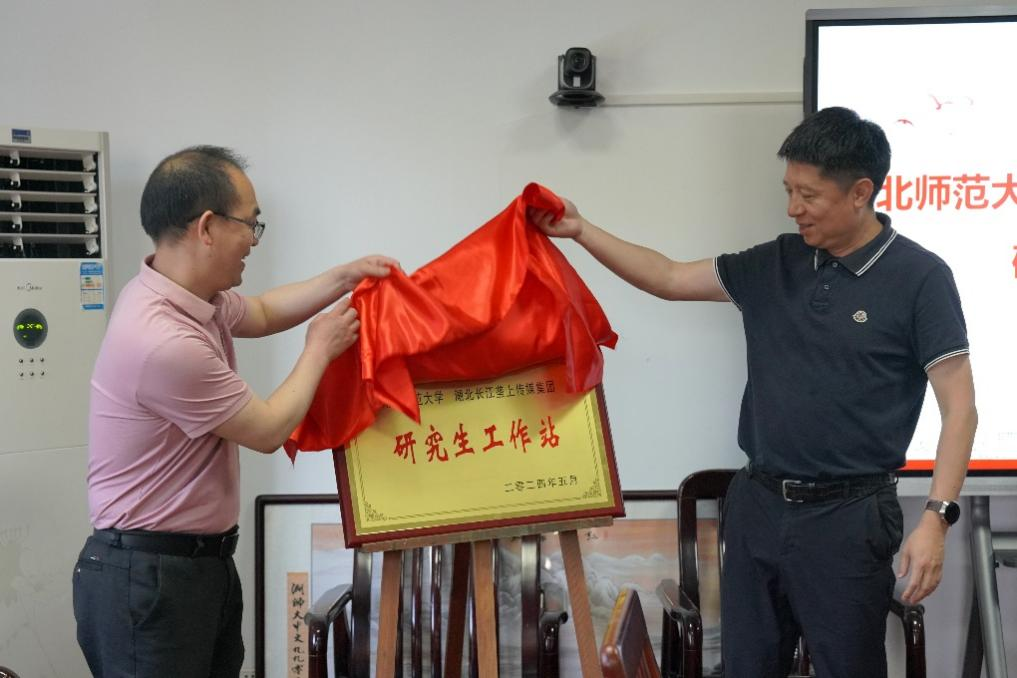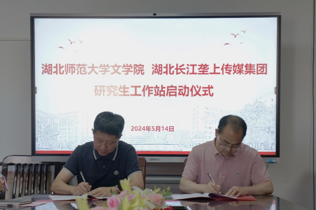 启动仪式上,车录彬与邓海分别代表湖北师范大学文学院和湖北长江垄上传媒集团共同签订研究生工作站合作协议,并为工作站揭牌。