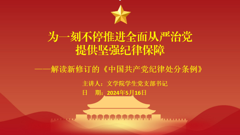 为深入学习贯彻习近平新时代中国特色社会主义思想和党的二十大精神,扎实推进党纪学习教育走深走实,2024516日晚,文学院学生第一二三党支部分别开展了以学纪明责筑忠诚担当实干促发展”为主题的月主题党日活动暨理论学习活动。