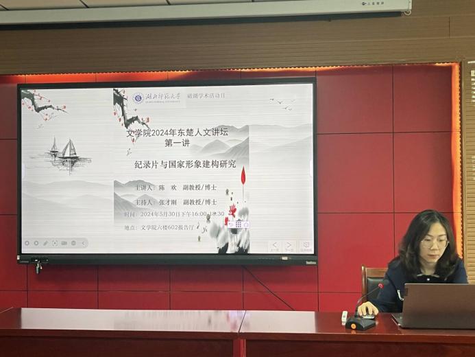 5月30日下午,文学院2024年“东楚人文论坛”正式开讲。陈欢博士以“纪录片与国家形象建构研究”为主题做了学术报告,文学院相关专业教师、新闻系全体研究生及部分本科生参加了活动。