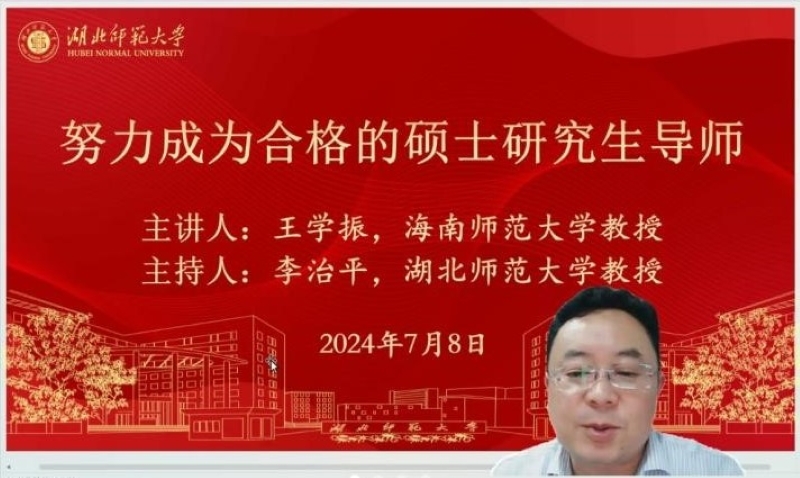 为全面落实立德树人根本任务,加强导师队伍建设,2024年7月8日下午,文学院进行了硕士研究生导师培训会,海南师范大学文学院院长王学振教授应邀作线上专题报告,报告会由文学院院长李治平教授主持,文学院全体硕士研究生导师参加会议。
