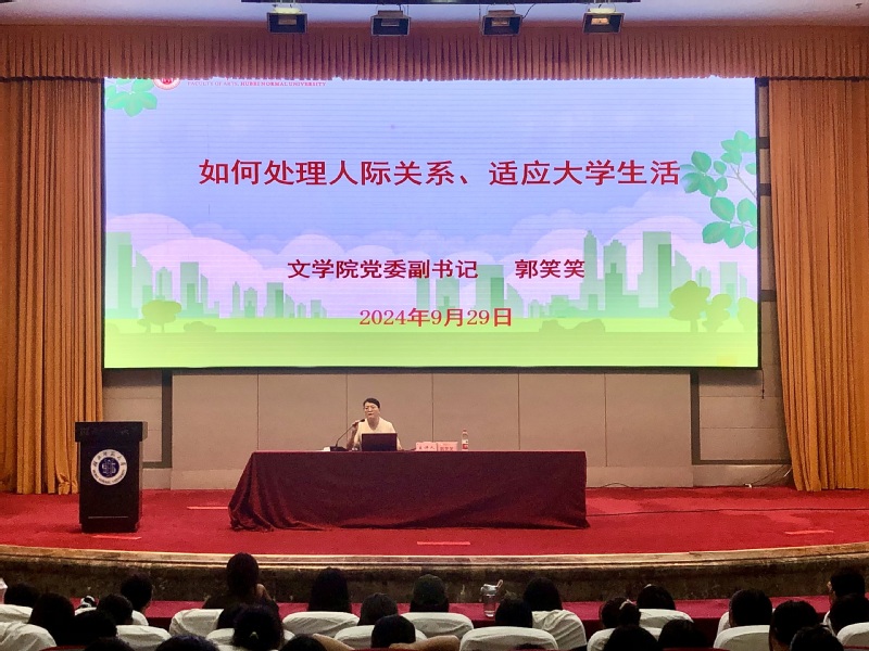 为帮助新生把握大学新航向,指导新生开好头、起好步,奠定成长成才的良好基础,2024年9月30日上午,文学院于教育大楼报告厅开展新生入学教育系列活动第二讲——“如何迅速适应好大学生活”主题讲座,此次讲座由院党委副书记郭笑笑担位主讲,2024级全体新生参与本次活动。