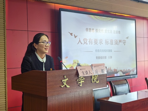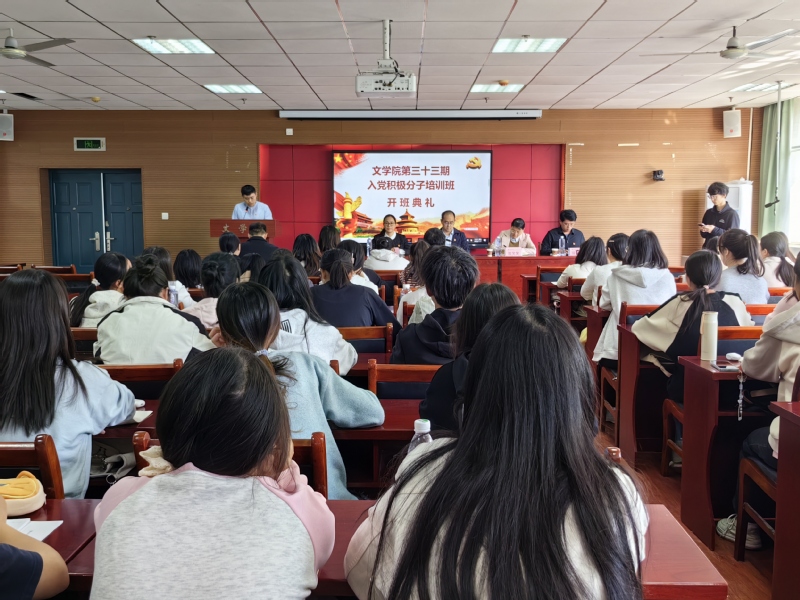 为深入学习贯彻习近平新时代中国特色社会主义思想和党的二十大和二十届三中全会精神,切实加强对入党积极分子的教育和培养,11月7日下午,文学院于人文楼21A602报告厅举办第33期入党积极分子培训班开班典礼暨培训第一讲。校党委组织部副部长应娜,文学院党委书记、分党校校长车录彬,院党委副书记郭笑笑,院学生第二党支部书记邱天来、学生第三党支部书记陈洋,辅导员董雅芳、吴鸿杰以及50名新确定发展的入党积极分子参加开班典礼。开班典礼由院学生第一党支部书记、分党校班主任张力主持。