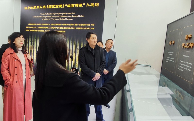 5日下午,余涛一行来到云梦县博物馆,参观出土秦汉简牍展,详细了解简牍内容、历史文化价值和保护研究情况。余涛指出,我们紧跟习总书记步伐来到云梦县博物馆参观学习,就是要深入学习领会习近平总书记考察湖北重要讲话精神,激发师生文化自信,激励师生主动作为,努力在文物保护、研究及传统文化传承创新方面作出贡献。