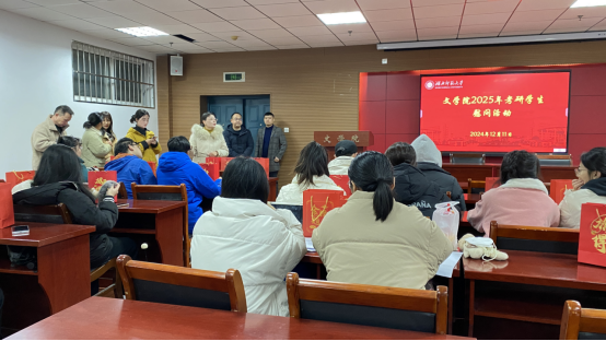 距离2025年考研仅剩10天,为缓解文学院考研学生的备考压力,提振士气,增强信心,传递温暖,2024年12月11日下午,文学院在21A602开展2025届考研学生慰问活动。学院党委书记车录彬、党委副书记郭笑笑、学工办主任张力、2025届全体班主任共同为考研学生送上了诚挚的慰问与祝福。