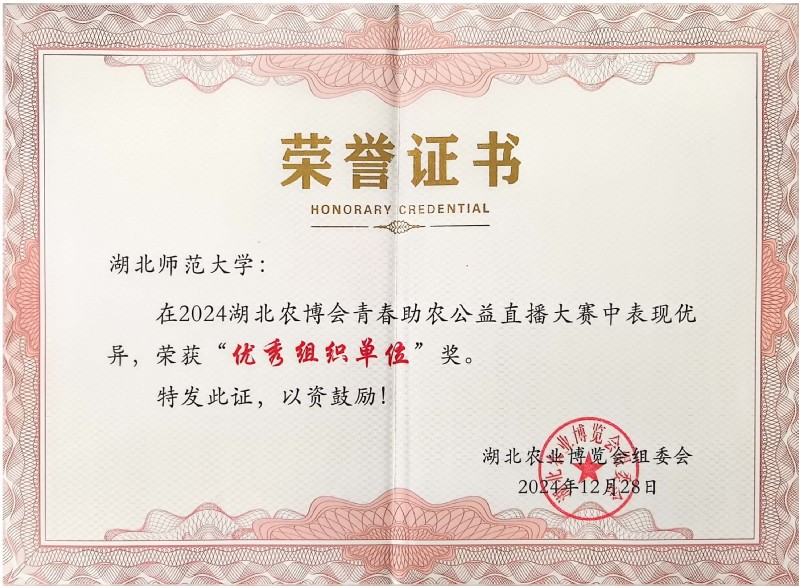 新学期伊始,我校收到来自湖北农业博览会组委会的喜讯:在2024湖北农博会青春助农公益直播大赛中,我校文学院新媒体工作室的师生表现出色,学校荣获“优秀组织单位”称号。