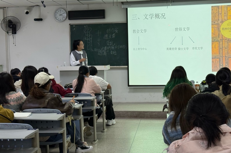 张琳琳老师以清晰的逻辑框架展开教学,将中世纪文学系统划分为教会文学与世俗文学两大板块进行深入解析。在讲授教会文学时,她结合经典文本,阐释了宗教思想对中世纪文学的深刻影响,突出其象征性、寓言化的艺术特征与精神教化功能。随后,她聚焦世俗文学,通过横向对比与典型案例分析,生动展现了英雄史诗的雄浑壮阔、骑士文学的高贵理想与市民文学的世俗活力。这堂课充分展现了张老师作为青年教师的风采,她不仅善于将文学性与学术性有机融合,还通过PPT展示文献插图、播放经典歌剧选段等多样化的教学手段,有效增强了课堂的感染力。师生互动积极,课堂氛围热烈。